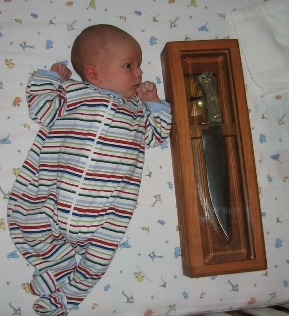 Those of you who know my father will not be surprised that he made Jack a Bowie Knife as a birth gift. My dad has been involved with the Boy Scouts for ages and he believes that all boys need to have a knife like this while growing up. But to make a knife – from a huge hunk of steel into something that can cut things – is amazing to me. My family members are all incredibly talented, and of course my dad is no exception. He made the blade, the handle, the sheath and even the box that holds the knife. Here Jack is admiring his gift: