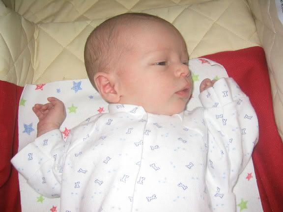 Jack and I visited the lactation consultant yesterday and made a few adjustments to our feeding so we can finally get rid of the bottles! He has gained over a pound this week, mostly due to the enormous amounts of formula we've been giving him. He's starting to grow into his skin a little and his cheeks are a little fatter.